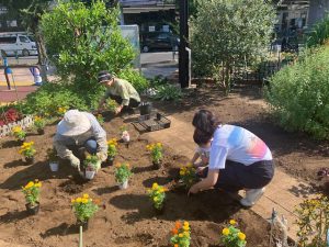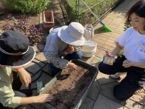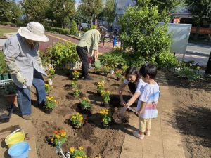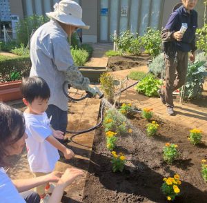 続いて夏の間にゴーヤを植えていただ畑に、マリーゴールドを植付けして、菜の花種まきを行っていただきました。