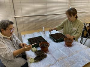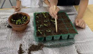 初めに前回種まきをした花苗の植替え作業を行っていただきました。