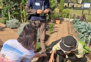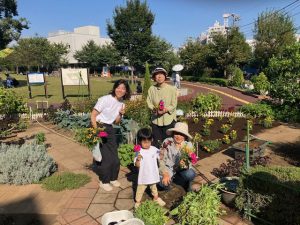 モロヘイヤやバジルなども収穫して、花壇に咲いているお花も摘んで、皆で集合写真を撮って終了です。