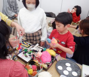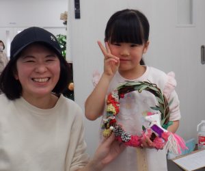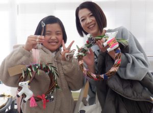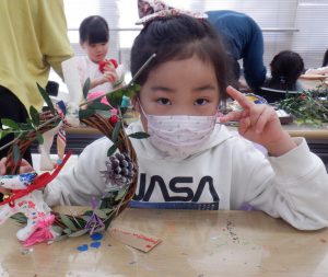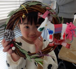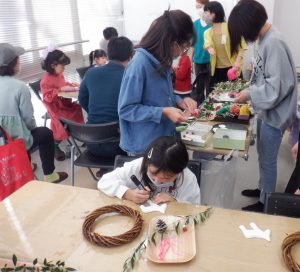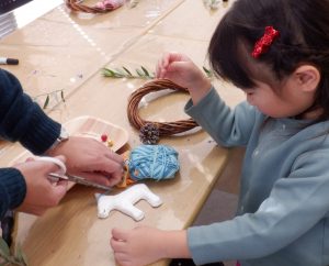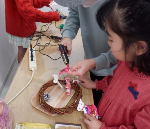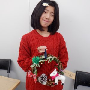 《図画工作太陽のいろ》野中かおり先生のご指導でチャームや木の実、布、鈴、そして来年の目標を短冊に書いて、お正月まで飾れるキュートなリースを作りました。