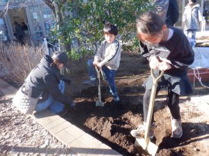 つづいてポタジェで畑の土の“天地返し”(または“寒起こし”)と、白菜の冬支度を行っていただきました。