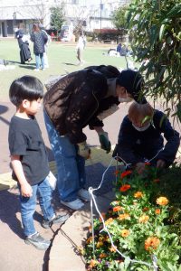 続けて、パンジーなど花壇の花柄摘みを行っていただきました。