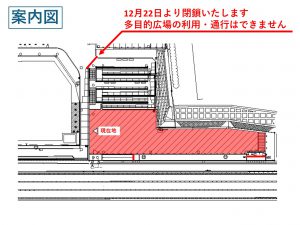 開放時期は2月下旬を予定しています。その間の多目的広場の利用・通行はできません。